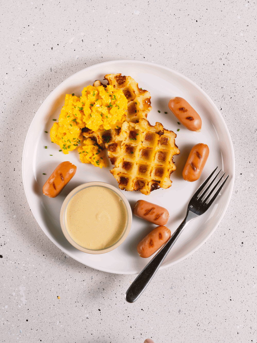 Gofres, huevos fritos o revueltos y salchichas de pavo tipo cóctel con salsa dijonnaise.