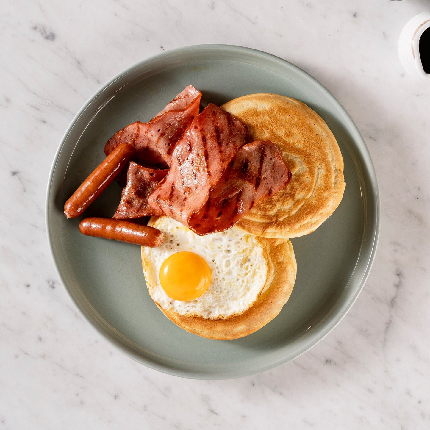 Pancakes con miel de maple, tocineta de pavo, huevo frito y salchichas de pavo campesinas.