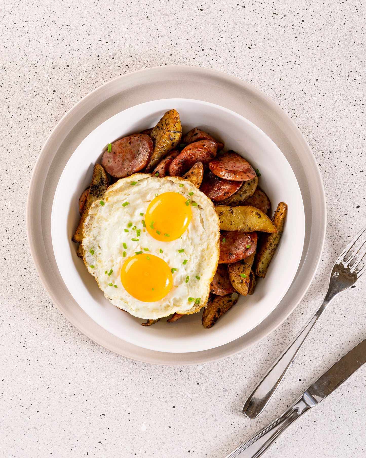 Huevos fritos, salchicha de pavo polaca