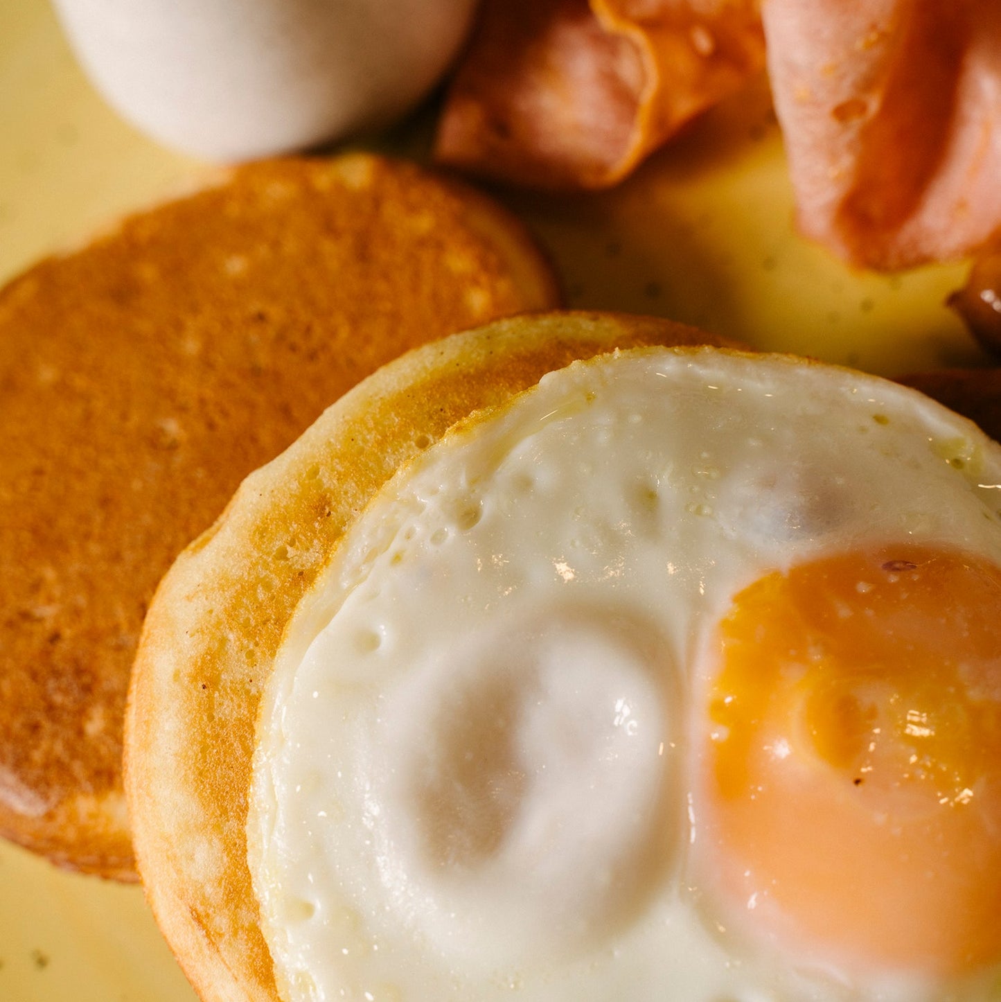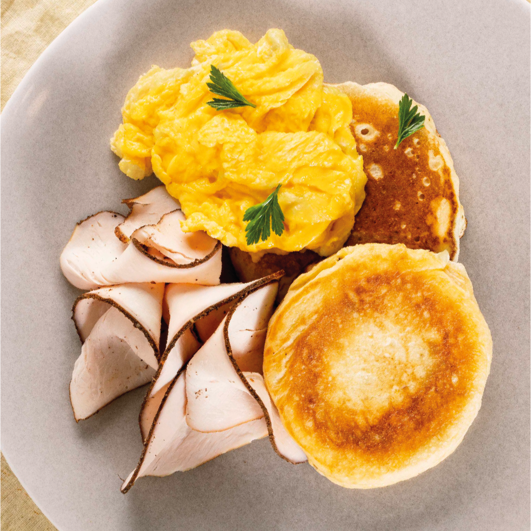 Pancakes con huevos fritos o revueltos y una porción de pechuga de pavo.