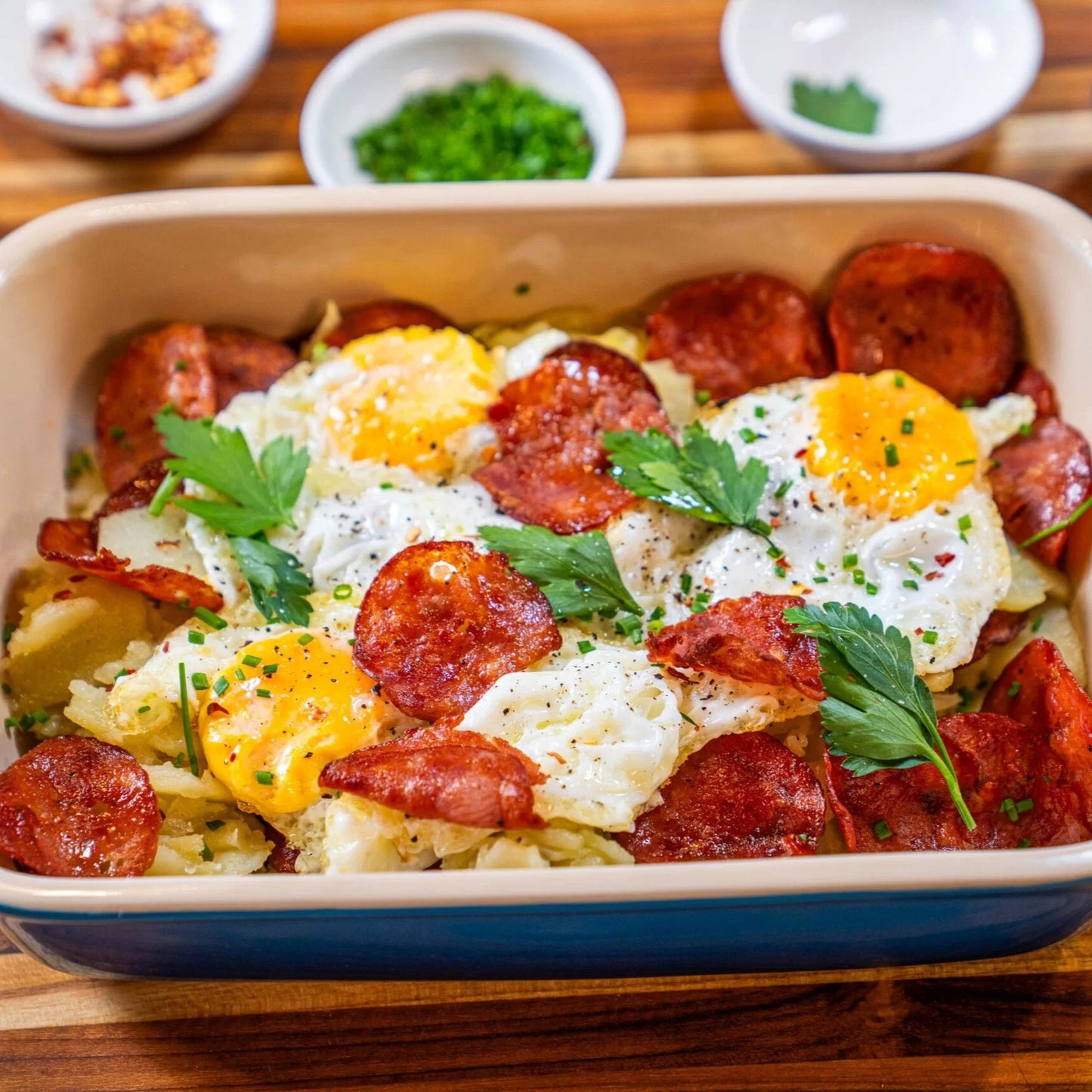 - En una refractaria ponemos por capas las papas y el Peperoni de Pavo Delipavo, por encima quedan los huevos y decoramos con perejil, sal y pimienta.