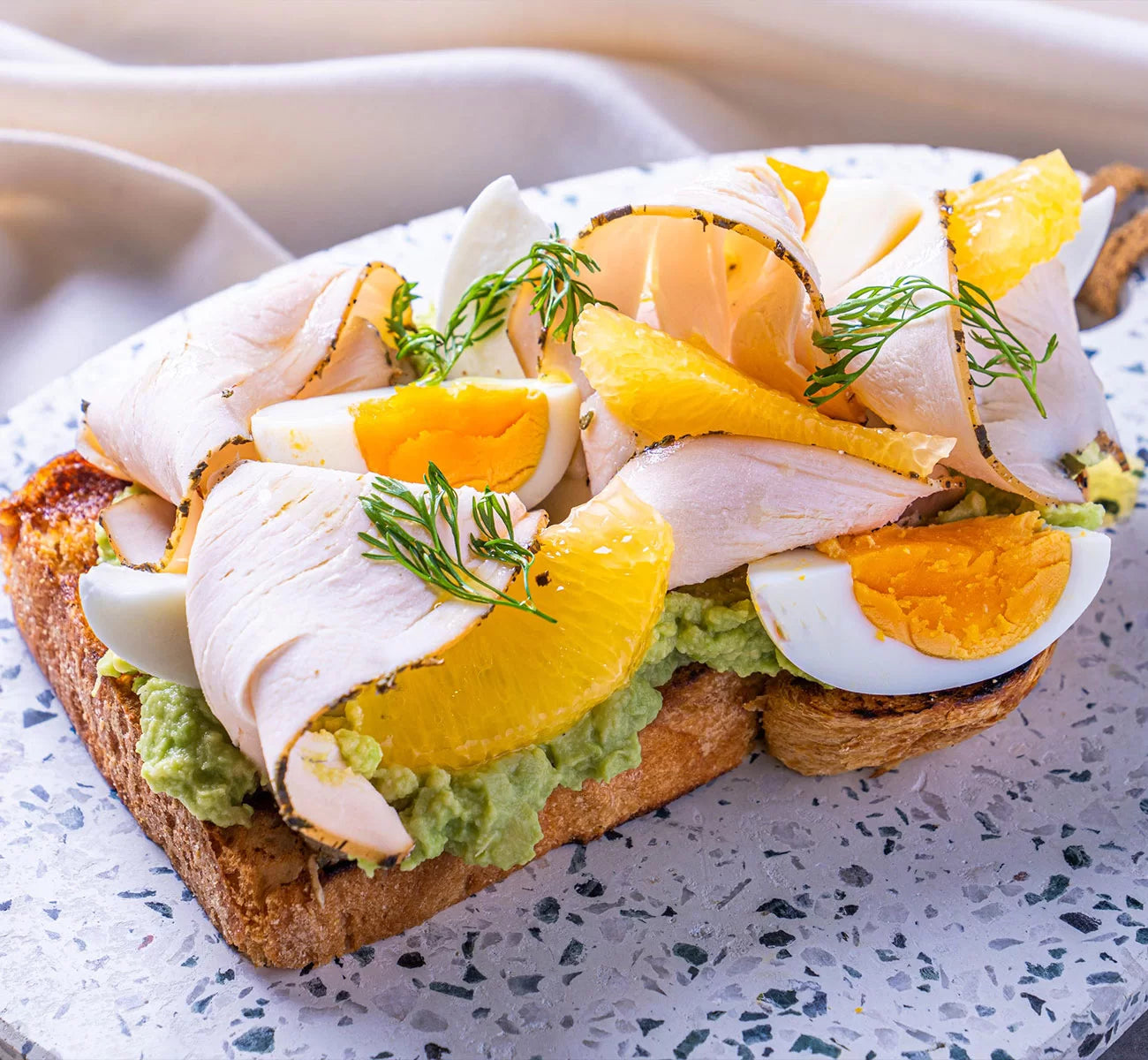 Tostadas de Aguacate con Pechuga de Pavo a la Naranja