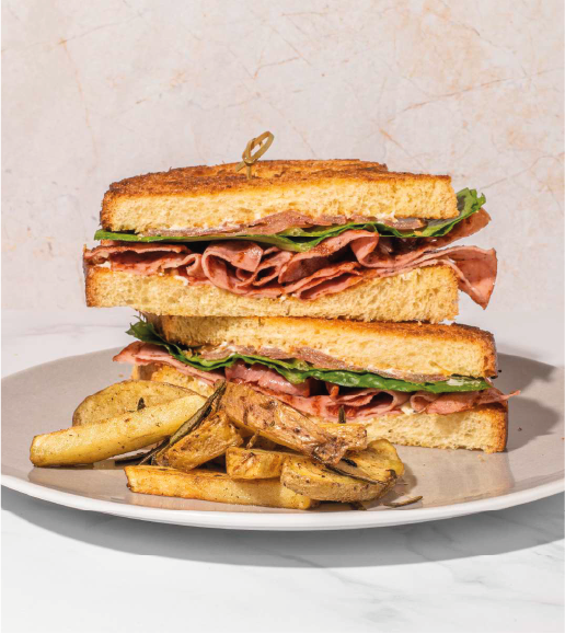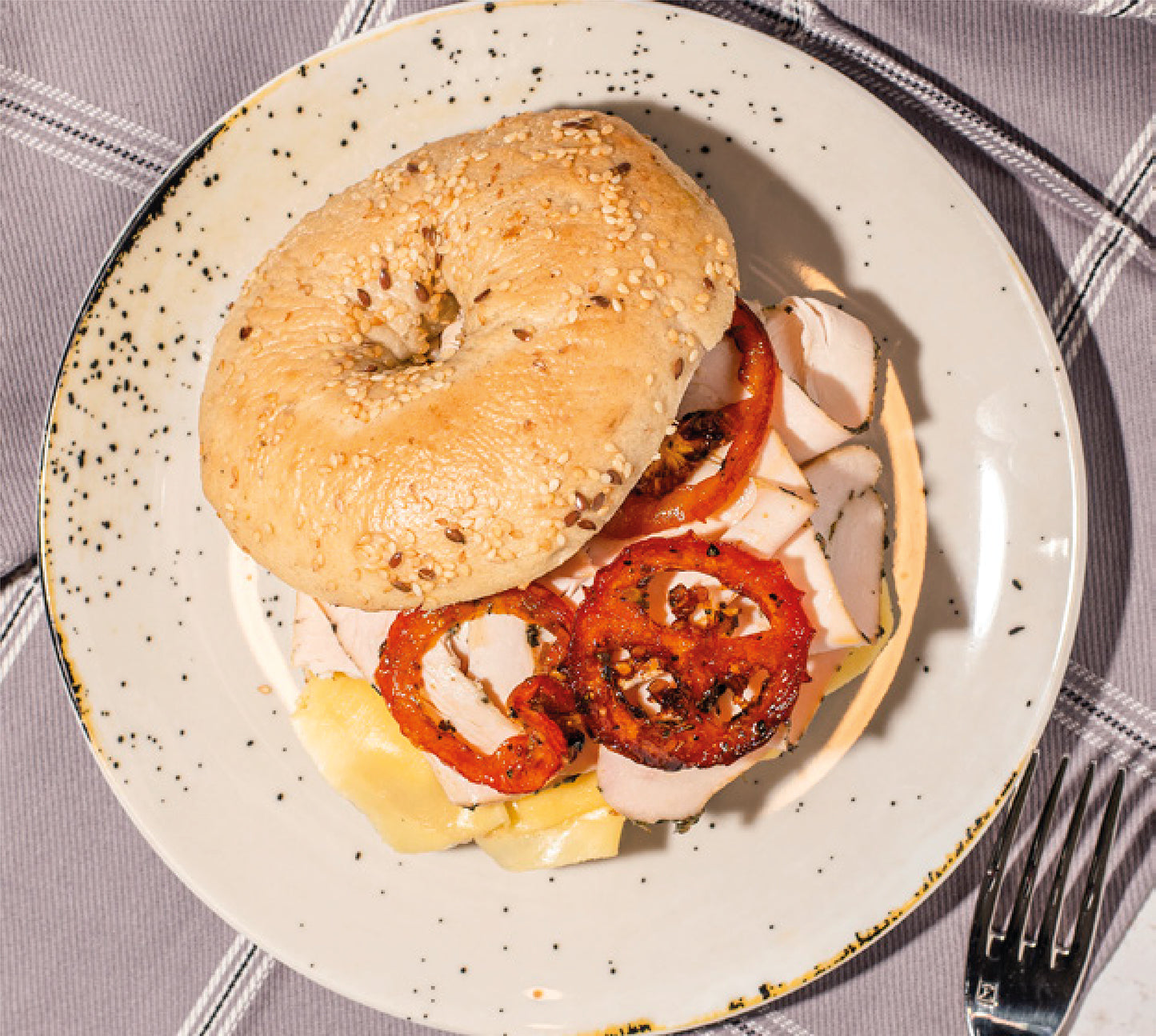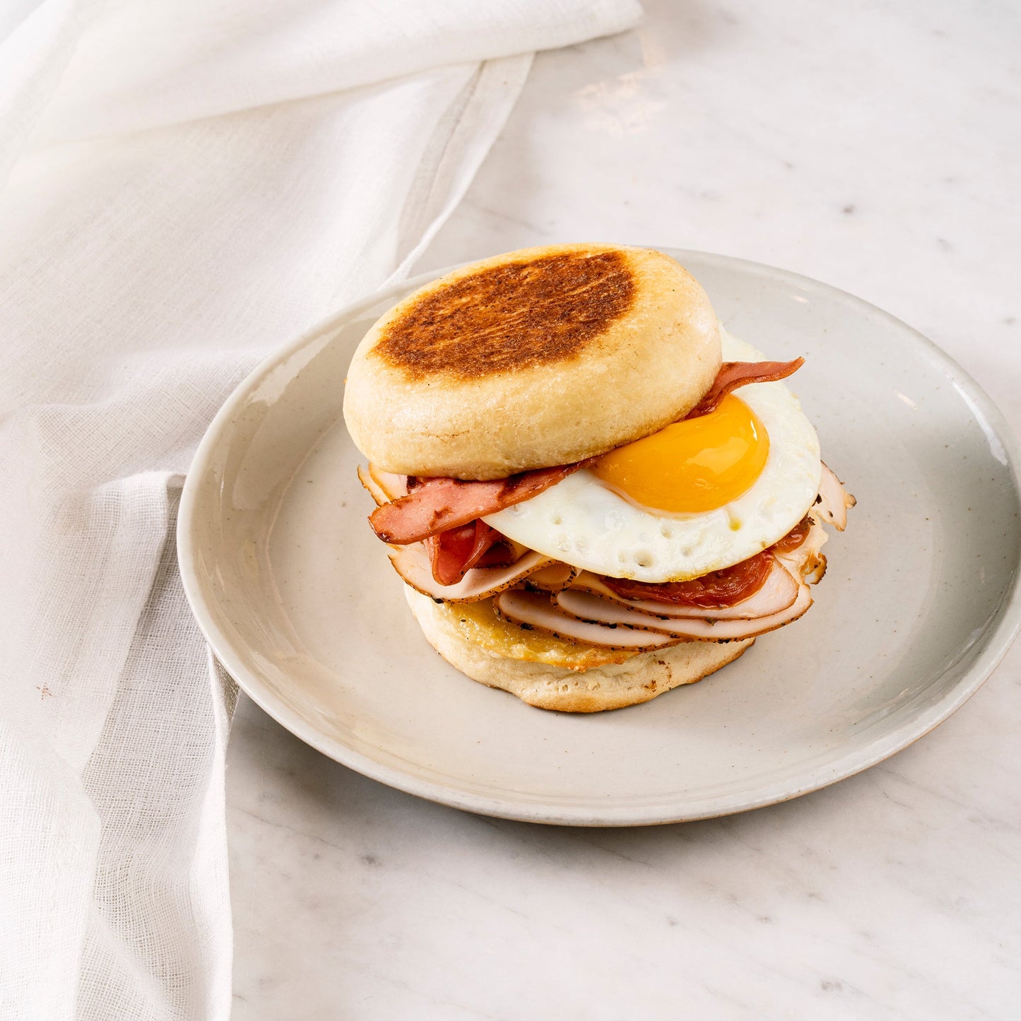 English Muffin con pechuga de pavo, tocineta de pavo, queso provolone, huevo frito o revuelto, tomates confitados y salsa