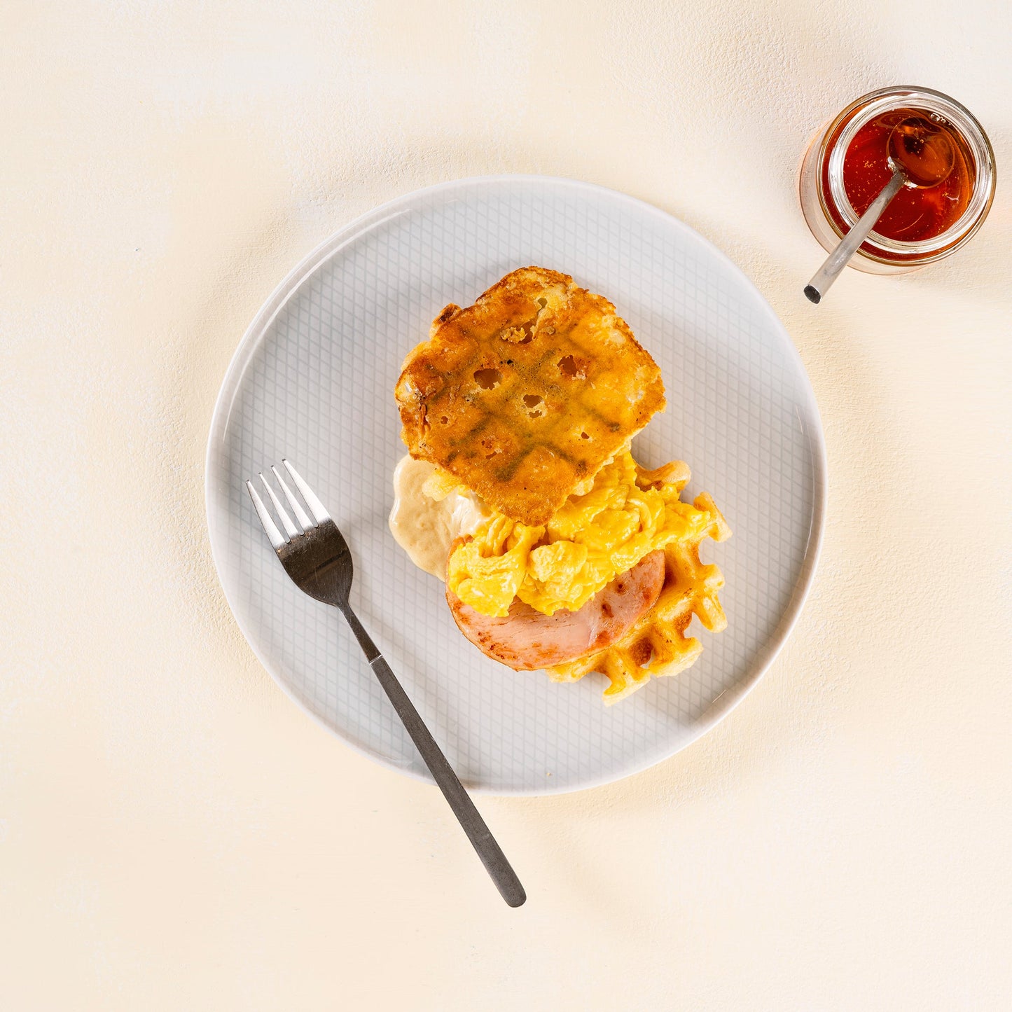 Gofres de yuca gratinados con queso holandés, rollo de pavo ahumado, huevo frito o revuelto y salsa dijonnaise