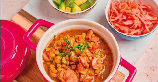 Sopa de lentejas con salchicha de pavo, tocineta de pavo y aguacate.